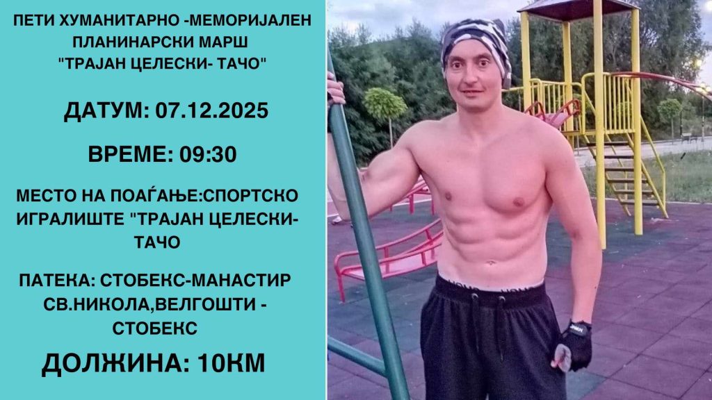 По тој повод на 07.Ноември (недела) Ве покануваме на петти по ред меморијално-хуманитарен марш кој ќе започне во близина на неговиот дом т.е. на спортското игралиште кое неодамна во негова чест беше именувано во негово име: „Трајан Целески-Тачо“ Патеката започнува од нас. Видобишта – Манастир Свети Никола, Велгошти и назад. Патеката е умерена и е во должина од 10км во двата правци. Водич на турата ќе биде Дејан Ангелоски, апсолутен шампион во планинско трчање кај нас и повеќекратен победник на меѓународни трки во скајранинг.