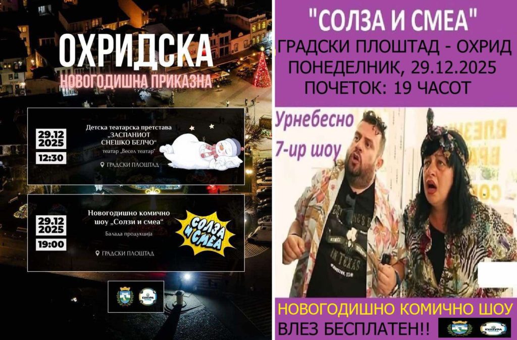 дома Категории Вести Утре, понеделник, со почеток од 19.00ч, Солза и Смеа на Охридскиот плоштад! КатегорииВести Утре, понеделник, со почеток од 19.00ч, Солза и Смеа на Охридскиот плоштад! 28 декември 2025 34 Утре, понеделник со почеток од 19.00ч, СОЛЗА И СМЕА на охридскиот плоштад со бесплатен влез. Шоуто е дел од новогодишната програма на Општина Охрид.